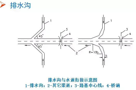 (3)排水溝水流注入其他溝渠或水道時,應使原水道不產(chǎn)生沖刷或淤積。通常應使排水溝與原水道兩者成銳角相交,交角不大于45?,有條件可用半徑R=10b(b為溝頂寬)的圓曲線朝下游與其它水道相接。