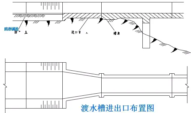 (1)設(shè)置要點:不宜過長,溝底應具有1%~2%的縱坡,出水口底面標高應高出溝外最高水位20cm,以防水力倒?jié)B。