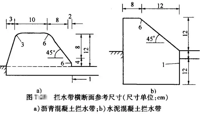 攔水帶可由瀝青混凝土現(xiàn)場澆筑,或者由水泥混凝土預制塊鋪砌而成。