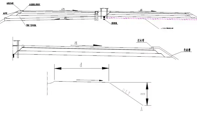 倒虹吸的設(shè)置往往是因路基橫跨原有溝渠,且溝渠水位高于路基設(shè)計標高,不能按正常條件下設(shè)置涵洞,此時采用倒虹吸是可行的方案之一。 渡水槽的設(shè)置是因原水道與路基設(shè)計標高相差較大,如果路基兩側(cè)地形有利,或當?shù)卮_有必要,可設(shè)簡易橋梁,架設(shè)水槽或管道,從路基上部跨越,以勾通路基兩側(cè)的水流。