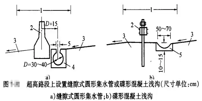 (1)寬度小于3m且表面采用鋪面封閉的中央分隔帶排水,降落在分隔帶上的表面水排向兩側(cè)行車道,其坡度與路面的橫坡度相同;在超高路段上,可在分隔帶上側(cè)邊緣處設(shè)置緣石或泄水口,或者在分隔帶內(nèi)設(shè)置縫隙式圓形集水管或碟形混凝土淺溝和泄水口,以攔截和排泄上側(cè)半幅路面的表面水。緣石過水斷面的泄水口可采用開口式,格柵式或組合式;碟形混凝土淺溝的泄水口采用格柵式。