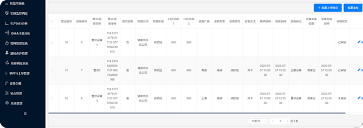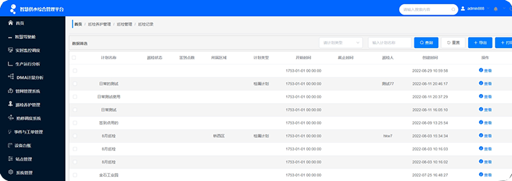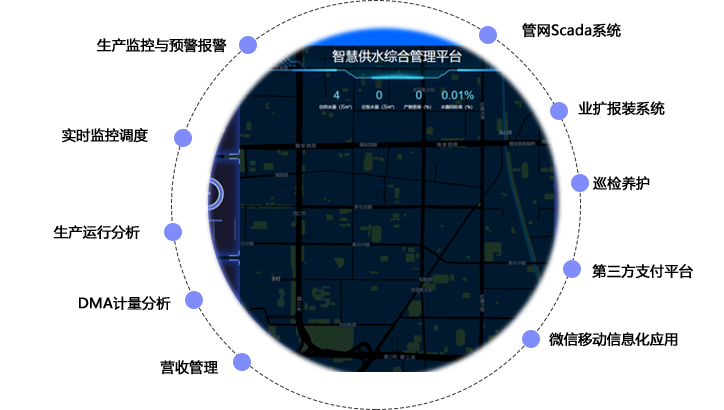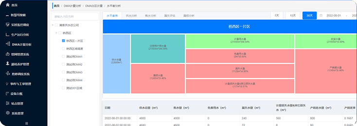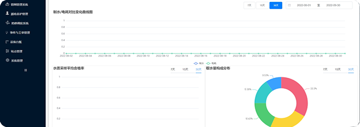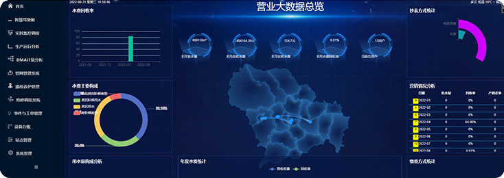 取水分析、消耗產(chǎn)出、水質(zhì)分析、水壓分析、運(yùn)營分析、設(shè)備統(tǒng)計(jì)
