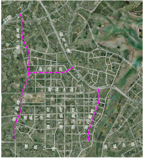 本次設計包括智城一路、智城五路、海寧街三條市政道路。智城一路為高地智慧城內南北走向的城市主干路,南起慧城三街,北至325國道,路線全長5198.815m,紅線寬度40m,設計速度60km/h。智城五路為高地智慧城內南北走向的城市次干路,南起慧城三街,北至南海大道,路線全長2158.647m,紅線寬度36m,設計速度50km/h。海寧街為高地智慧城內東西走向的城市次干路,西起智城一路,東至南海大道,路線全長1862.438m,紅線寬度36m,設計速度40km/h。道路沿線主要為村莊及待開發用地,道路用地主要包括農民的居住用地、耕地、菜地、苗圃、山丘、林地和魚蝦塘等等,局部地段有嶺地、河流、石化管線及高壓線穿過,既有建筑物較多,類型包括民宅、祠堂、學校等,且與G325、S280、海洋大道及多條村道等既有道路存在多次交叉。